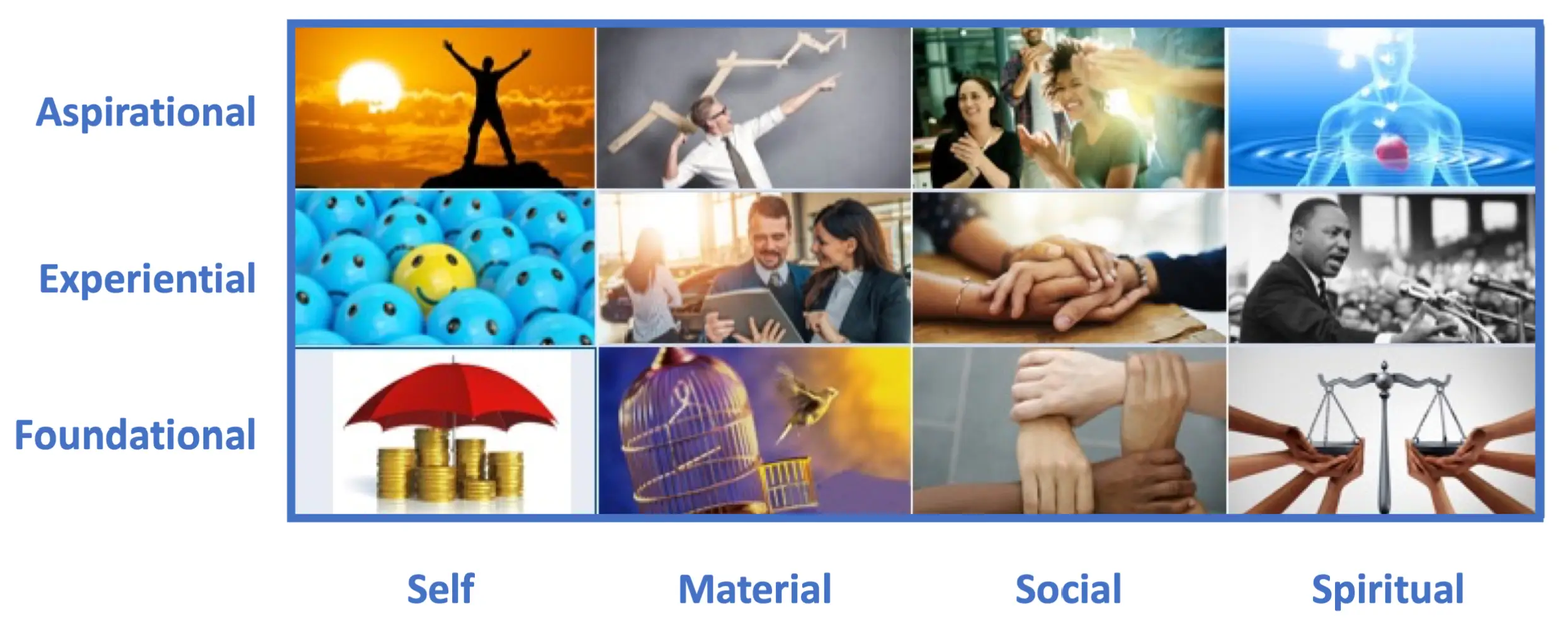 We also know from neuroscience that the brain process visual information much faster and ore efficiently than text. For this reason, we chose images as the medium to measure emotions. We have developed and validated a battery of images that represent the full range of human emotions. The images below are representative of that battery and arrayed in the 12 cell (the 4 domains of life times the 3 levels of experience equals 12 emotional need areas) AgileBrain framework. The images below are representative of the types used: