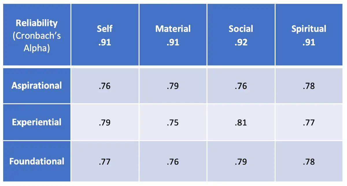 Before looking at the validity of any assessment instrument, we must assure that it is measuring the construct of interest consistently. The accepted statistical test of reliability is a Cronbach’s Alpha. Researchers say that a model “holds together” well if it achieves an Alpha of .60 and achieves a “gold standard of reliability” with an Alpha of .70 or more.