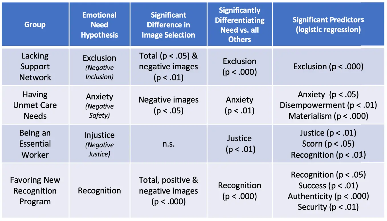 AgileBrain successfully confirmed the emotional need areas hypothesized for the identified groups. For example, the first group in the table, people who self-identified as lacking a support network, scored highest on Exclusion (the negative of Inclusion) with a very high probability of significance.