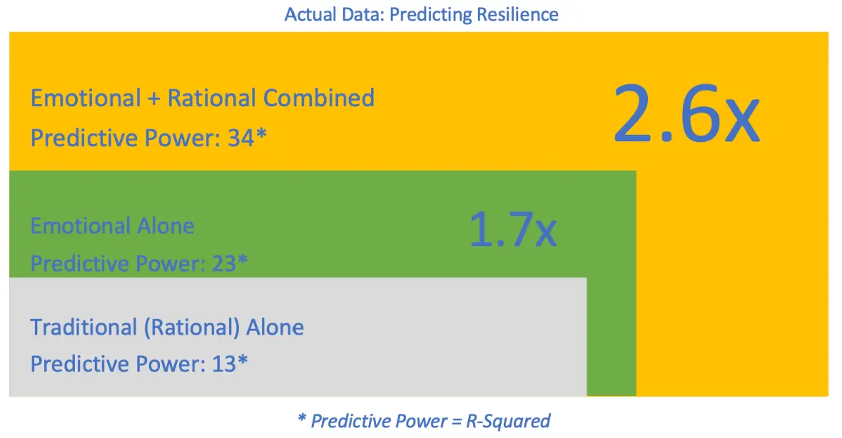 We have run multiple regression analyses using AgileBrain as a stand-alone predictor and in combination with traditional (rational) assessment techniques to evaluate its predictive power. The results have consistently shown that AgileBrain adds tremendous power in predicting a variety of important outcomes. The illustration below shows the added power in predicting an individual’s resilience (during the COVID-19 pandemic).