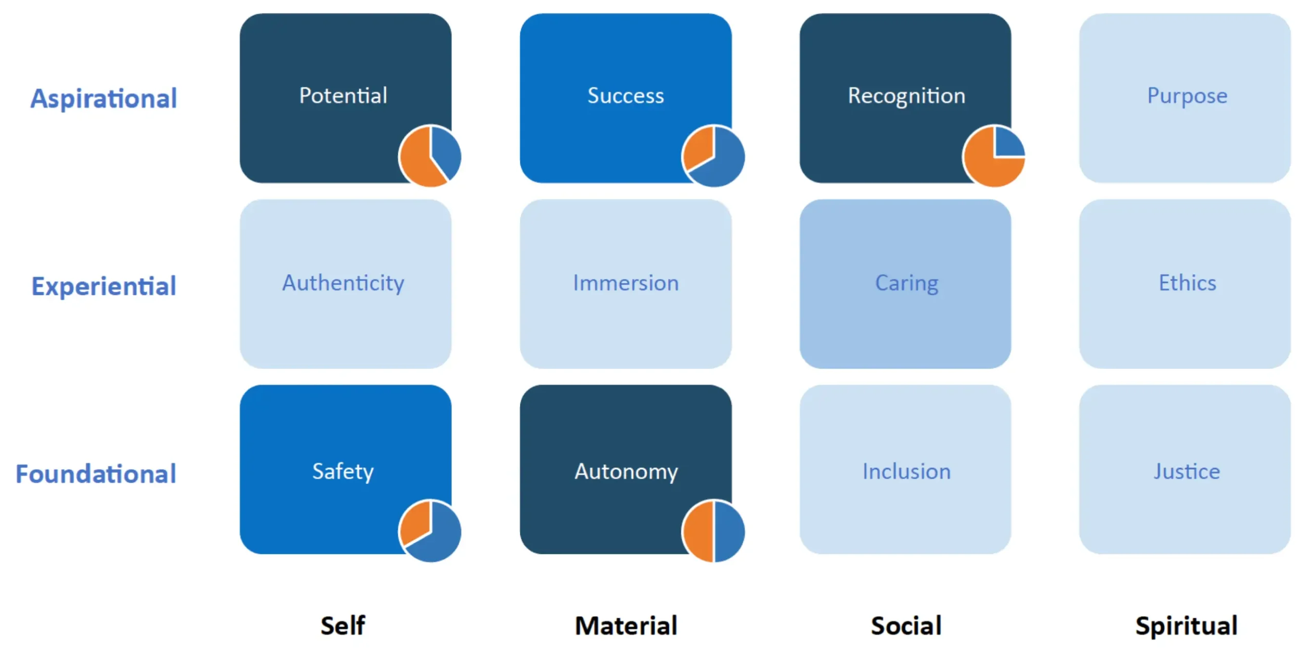 The coach started the discussion in the “here and now” of Experiential emotions (the middle row). There, his results were exceptionally quiet. Keith said, “after decades fitting in at a large company, I’m finally being me (Authenticity) and doing what I love (Immersion).”